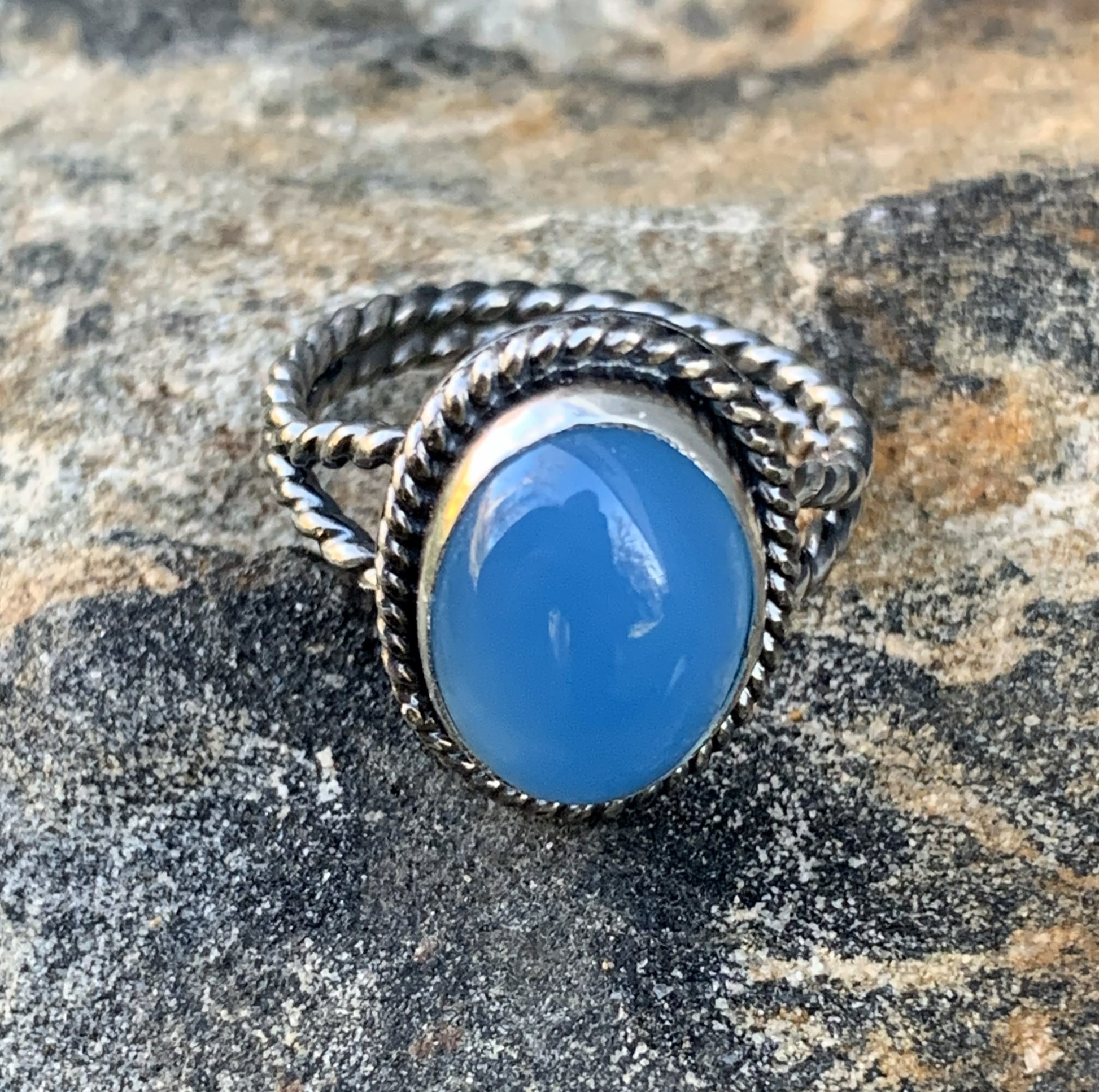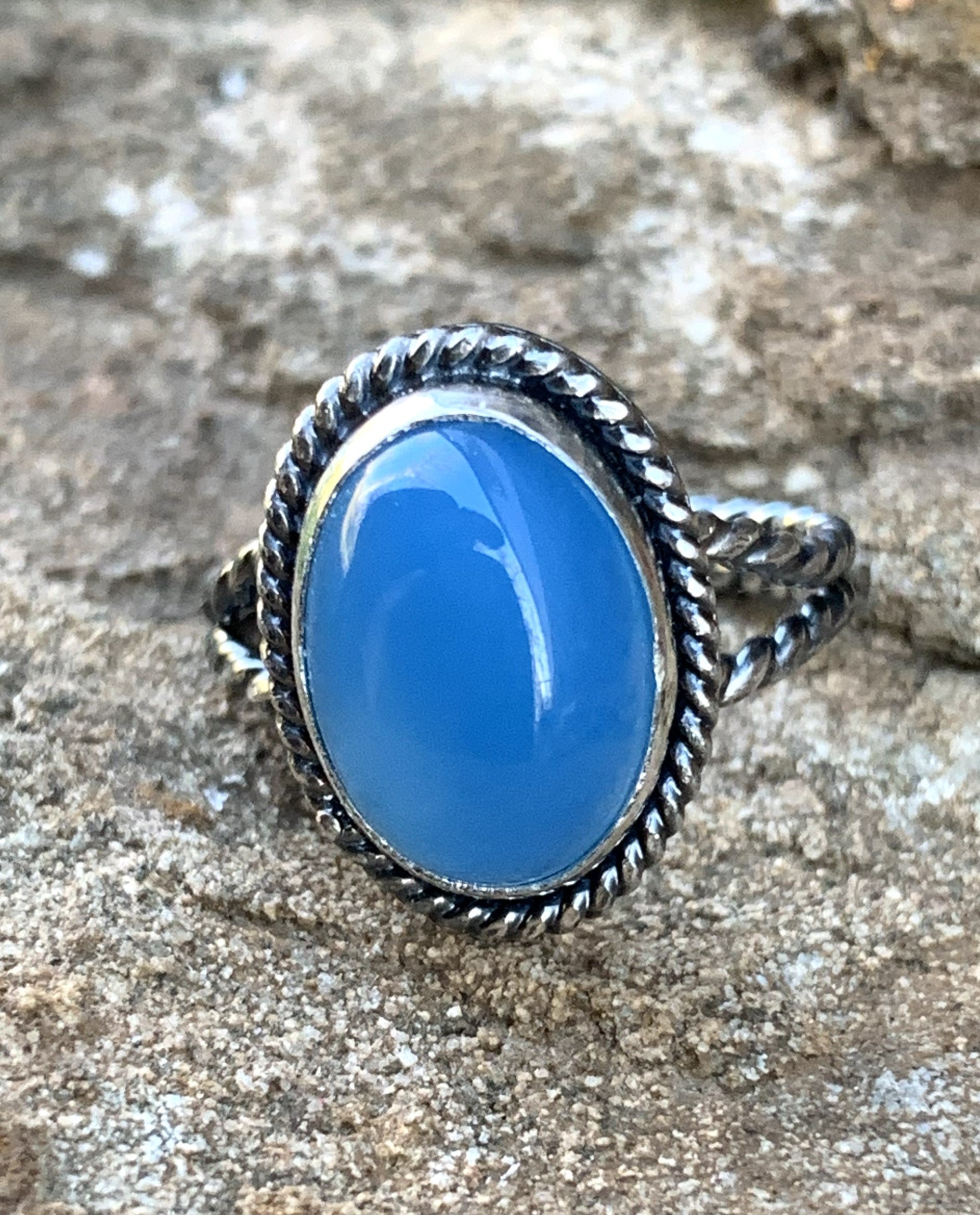 This handmade sterling silver ring features a natural blue chalcedony stone in a smooth oval cabochon. The stone measures 14×10mm and is set in a traditional bezel with a detailed beaded border. The ring is finished with a doubled twisted-wire shank for added strength, texture, and a classic artisan look.