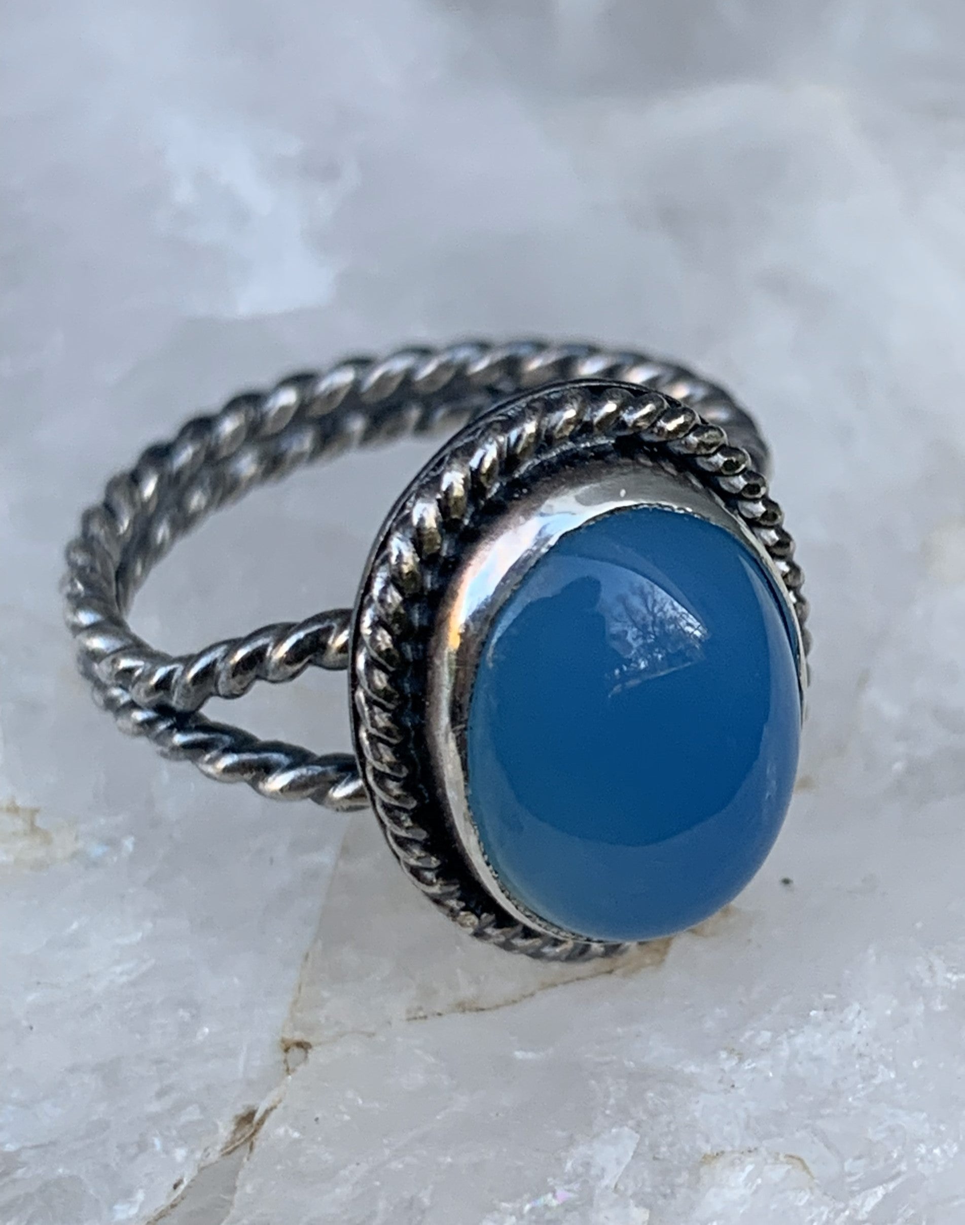 Every ring is crafted entirely by hand, making this a one-of-a-kind piece with timeless style. The calming blue chalcedony adds soft color that pairs well with both casual and dressy outfits.