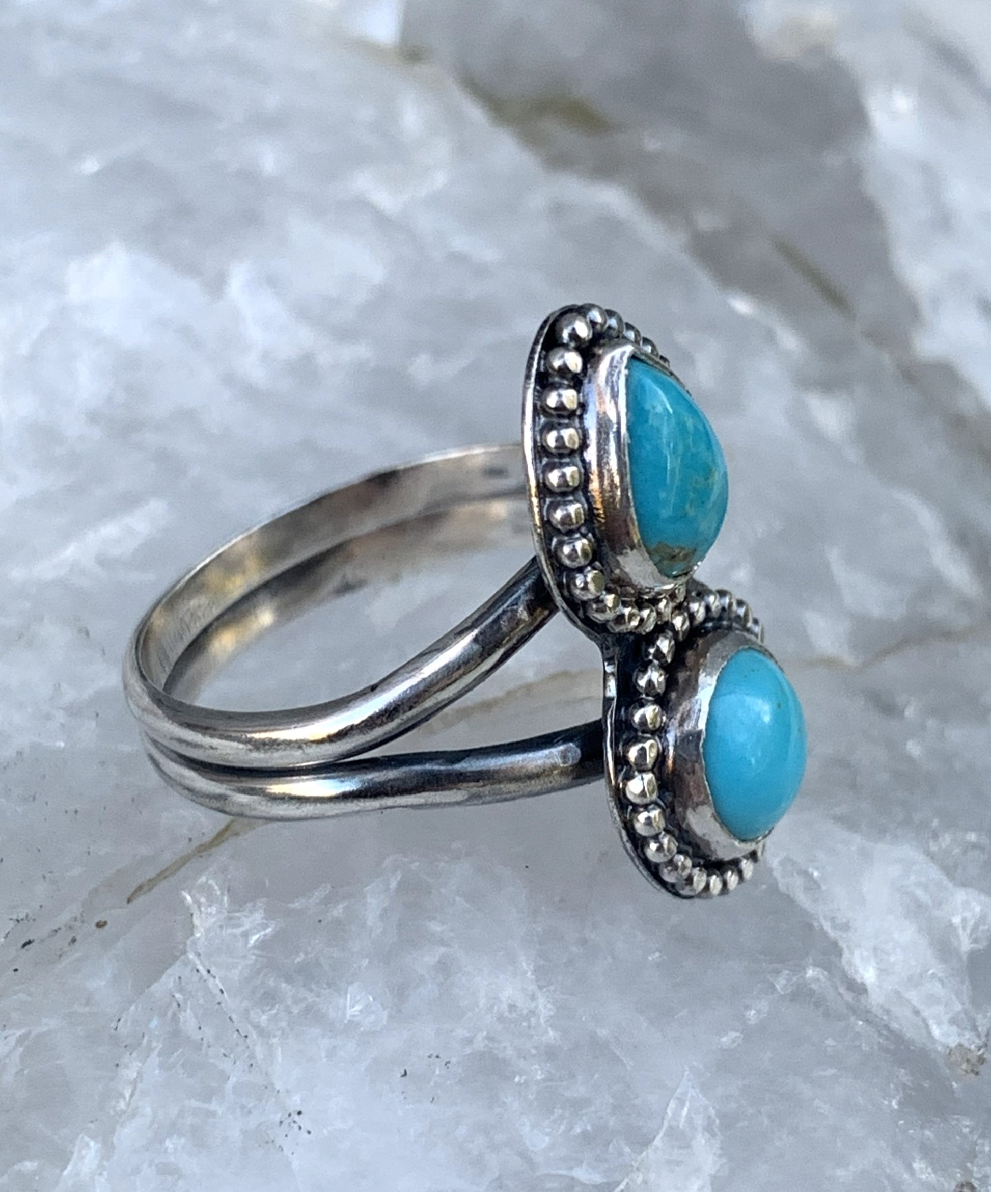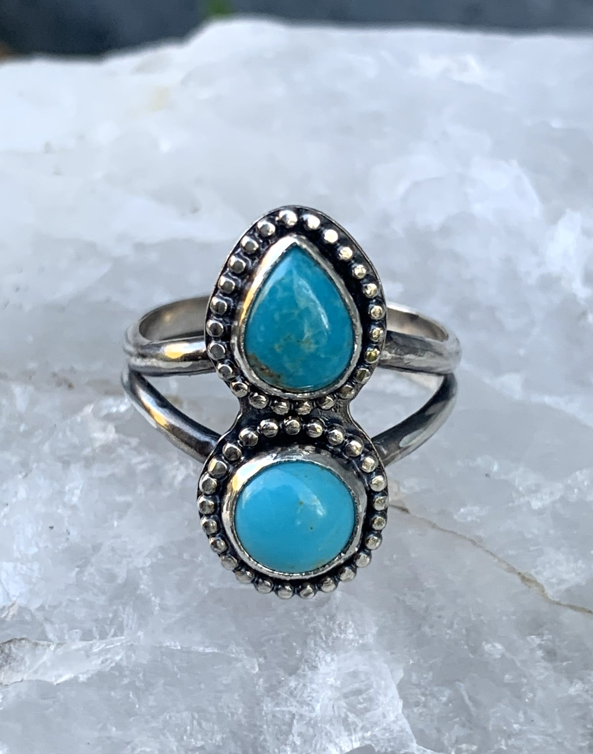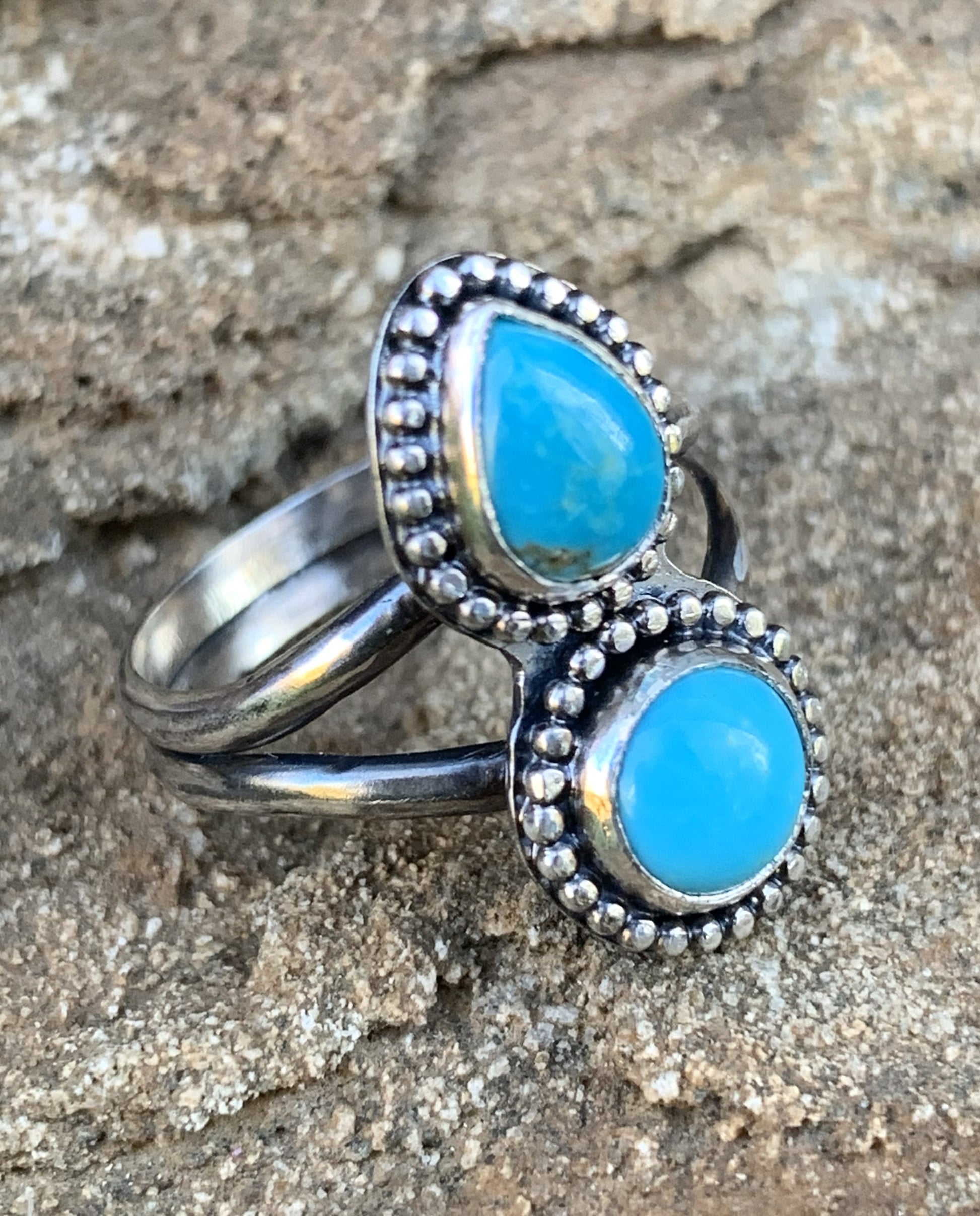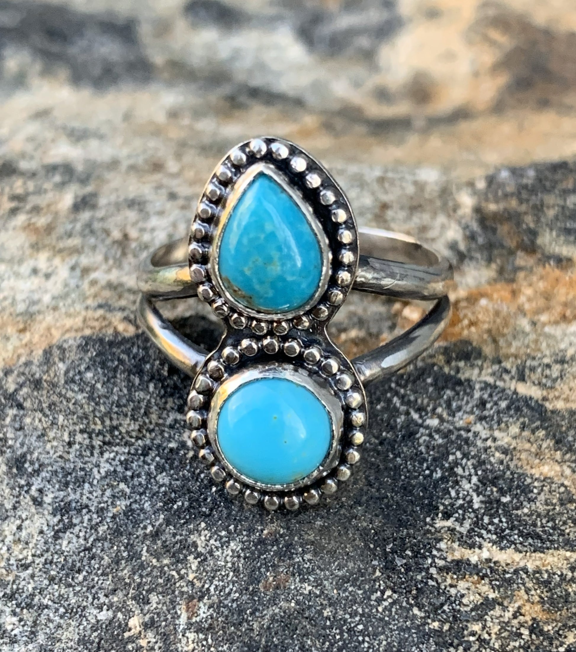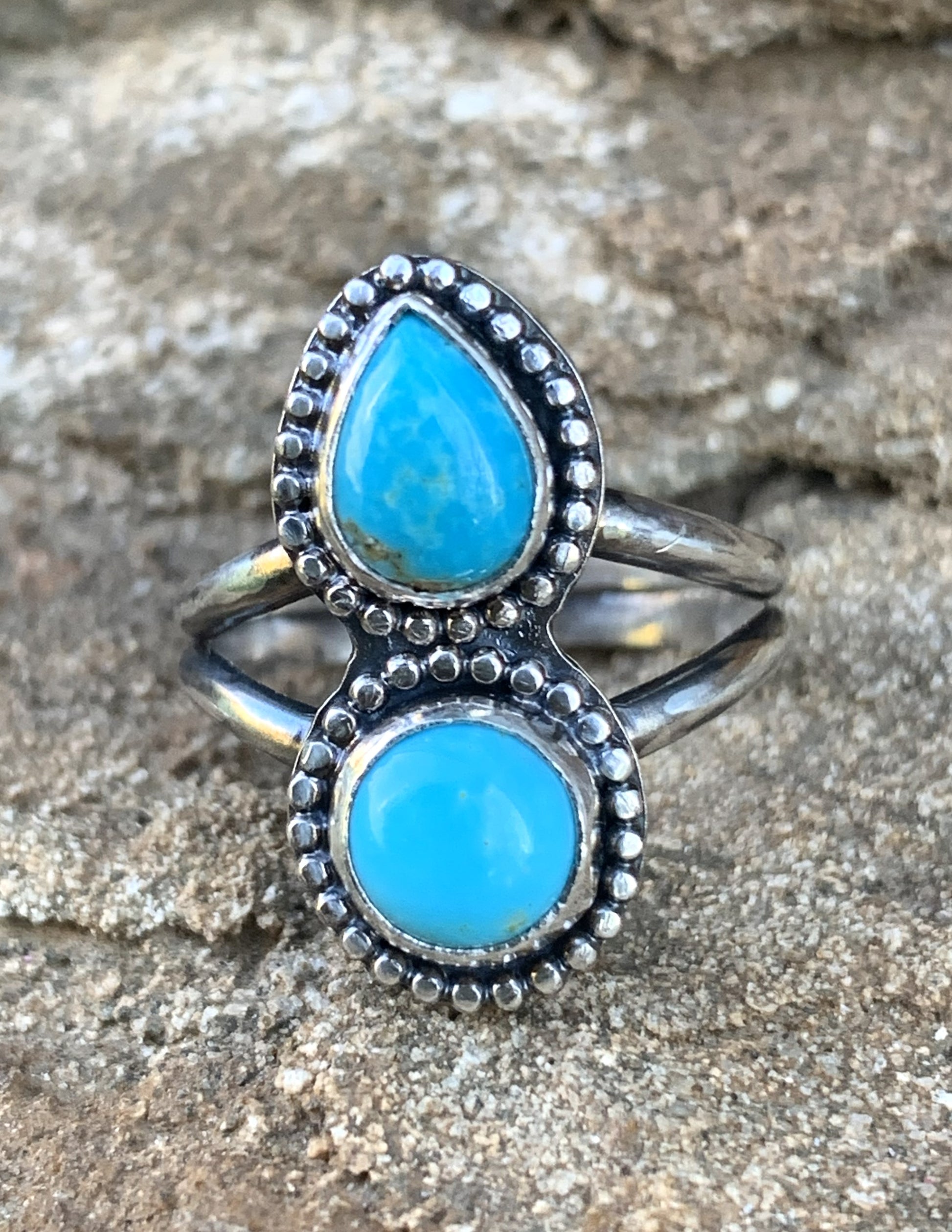This handmade sterling silver ring features two natural turquoise stones—one pear shape and one round—set in traditional bezels with a detailed beaded border. The double-stone layout gives this ring a bold artisan feel while still being comfortable for everyday wear. Each piece is handcrafted in my studio using solid sterling silver and genuine turquoise, making it a truly one-of-a-kind ring.