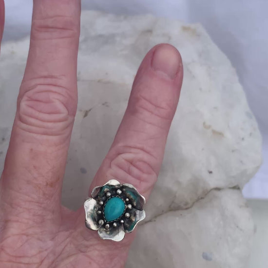 A one-of-a-kind sterling silver flower ring featuring a Kingsman turquoise at its center. Each petal is hand-formed and gently curved to create a dimensional, organic shape. Small silver accents surround the turquoise, giving this piece a rustic yet elegant look inspired by desert blooms.